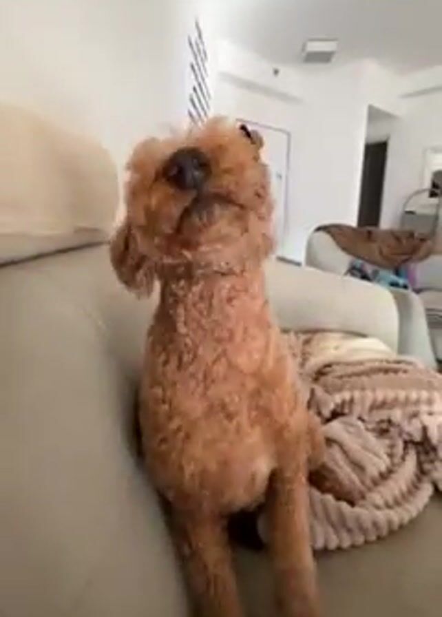 A curly, apricot-colored dog sits upright on a beige couch. The dog looks upward, licks its nose, and closes its eyes briefly. There is a plush blanket on the couch next to the dog, and a person in black walks in the background.