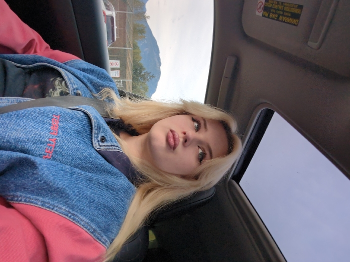The image captures a young individual, appearing female, with long blonde hair, light-colored eyes, and light eye makeup, seated in the front passenger seat of a vehicle