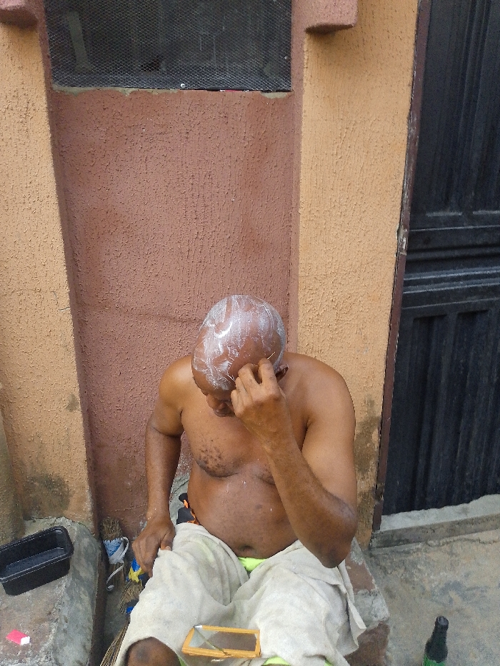 A shirtless man sits outside with shaving cream lathered on his bald head, fingers applying more. He is wearing light-colored pants and is seated near a building with a brown and beige wall. A small black container, a broken mirror, and a bottle are on the ground nearby. The scene appears to be a makeshift shaving setup outdoors.