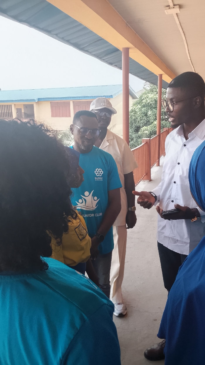 group of five people standing in a covered walkway, likely a school corridor in Street, Nigeria, at coordinates 6.487 latitude and 3.36 longitude. The main subject is a man in a white long-sleeved shirt and eyeglasses who is holding a black smartphone in his right hand, gesturing with his left hand while speaking to a person with their back turned to the camera. The person's back is turned towards the camera but they are wearing a turquoise shirt with a white 'Junior Club' inscription. The man is standing to the right of the camera, looking directly at the person in the blue shirt. Next to the man in the white shirt stands another man wearing a turquoise t-shirt with a 'Blueship Worldwide' inscription, and eyeglasses. He is standing to the left of the camera, also looking toward the person in the turquoise shirt. To the left of the man in the turquoise shirt is a third man who is wearing a white shirt and a tan cap. He is looking down at the person with their back turned to the camera. Beside the man in the white shirt is a person with their back turned towards the camera wearing a yellow shirt. The person is looking directly at the man in the white shirt. The floor is concrete, and the walkway has a railing to the right. The walls are light-colored and painted with a blue stripe. The image was taken outside, but the sky is not visible. The scene appears to be casual and the group is likely engaging in a conversation.
