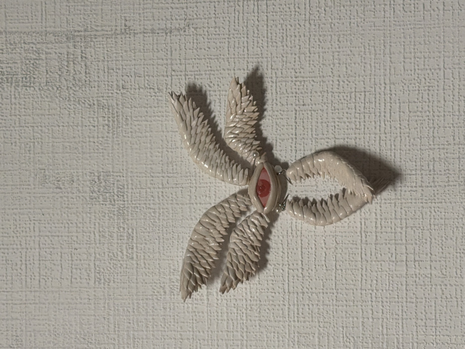 A bizarre, handmade pendant brooch rests on a textured, off-white surface. The pendant features a stylized vulva-like center, colored in red and pink. Emanating outwards are six curved, fleshy structures covered in rows of scale-like projections. Two of these projections are shaped into a closed circle. The brooch has an overall organic yet unsettling aesthetic. Small metal rings connect the central vulva to the surrounding structures.