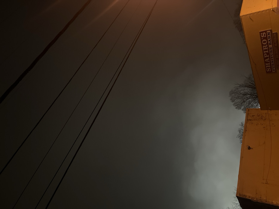 The image depicts an exterior nighttime scene in the City of Newburgh, United States of America. A dark, overcast sky with a luminous grey cloud layer occupies the majority of the frame, diagonally traversed by five dark overhead utility lines extending from the upper left to the lower right. An intense orange artificial light source is present in the upper right, causing a visible flare. At the bottom of the frame, two low-rise commercial buildings with flat roofs are visible, illuminated by an orange-yellow light, likely from streetlights or internal building lights. The building on the right features a prominent red sign displaying "SHAPIRO'S FURNITURE BARN" in a white border, with smaller red text underneath reading "FREE DELIVERY, HASSLE-FREE WARRANTY - NO PROBLEM!". A section of a similar-colored building is partially visible on the left. Bare deciduous trees are silhouetted against the illuminated clouds, positioned behind and between the structures. No individuals, vehicles, or explicit actions are present in the scene.