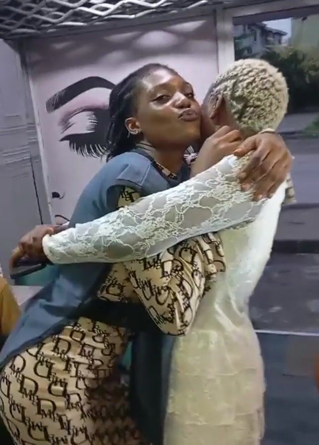 Two women are hugging and kissing each other on the cheek. The woman on the left has dark skin, dark hair in dreadlocks, and is wearing a dress patterned with letters and a blue sleeveless jacket. The woman on the right has light skin and short, blond, curly hair. She is wearing a white lace dress. They are both smiling and laughing. They are standing inside a building with a white latticed ceiling. Behind them is a wall with a large eye painted on it. Outside, there is a street. The camera is handheld and slightly shaky.