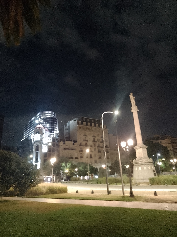 The image depicts a nighttime urban scene with illuminated buildings, streetlights, and a monument. A tall, white monument stands prominently, topped with a statue. Adjacent to it are ornate street lamps. The foreground shows a grassy area and walkway. The sky is dark with clouds, creating a contrast with the brightly lit structures. Modern and classic architectural styles are visible in the buildings.