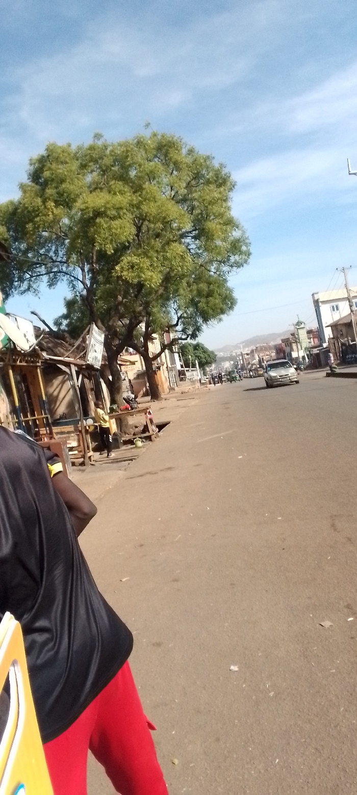 An eye-level shot shows a street scene under a blue sky with scattered clouds. A large, leafy tree stands beside a ramshackle wooden structure on the left. A car is moving along the asphalt road. In the foreground, a person wearing a black shirt and red pants partially occupies the frame. Yellow object is near the bottom left corner. Buildings line the street further down. Hills are visible in the distance.
