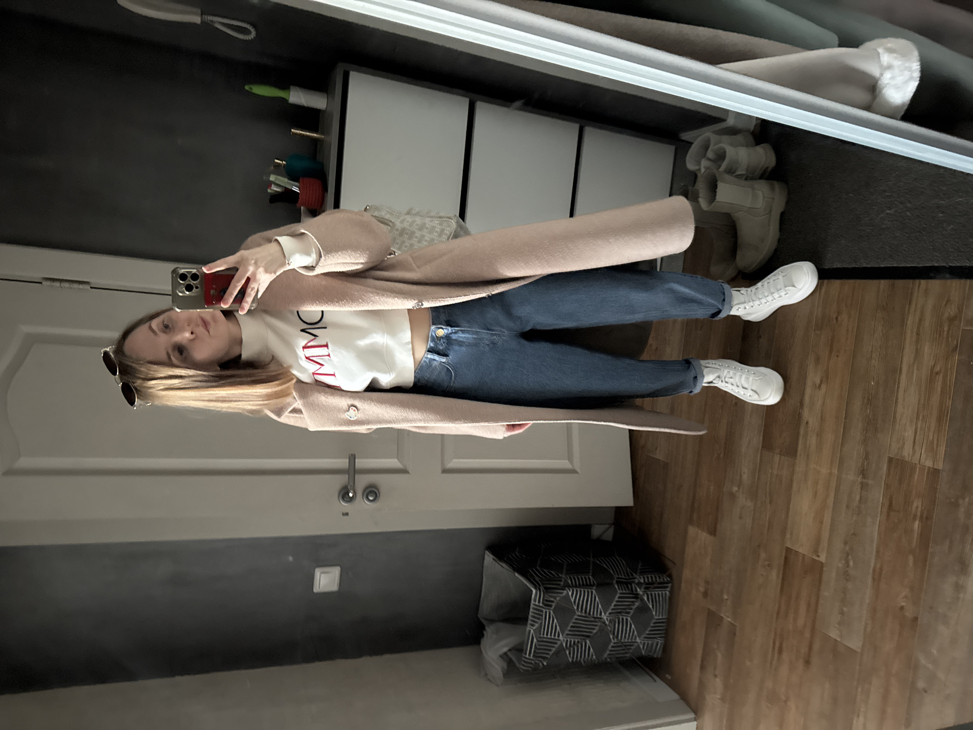 An indoor scene within a residential dwelling in Perm, Russia, depicts a fair-skinned adult female taking a mirror selfie. The woman, with shoulder-length light brown hair and sunglasses perched on her head, is dressed in a white cropped long-sleeved top with red lettering, light blue jeans, white high-top sneakers, and a light pink long coat worn open. She holds a smartphone with a red case in her right hand, directing it towards a full-length mirror. The environment features a brown wooden laminate floor. To the left, a dark grey wall abuts a lighter wall, showing a white electrical switch and a partially open white door with a silver handle. A geometric-patterned fabric bin containing items is positioned in the corner. To the right, a white three-drawer unit holds a red cup with utensils, a blue container, and a white lint roller on its surface. A white landline phone receiver is mounted on the wall above the unit. A pair of light-colored ankle boots rests on a dark mat on the floor near the mirror's lower right edge.