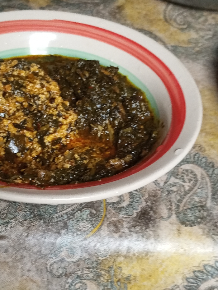 A close-up shot features a bowl of dark green, stew-like food. The dish appears thick, with some areas lighter in color, possibly due to different ingredients or textures. It's served in a white bowl with red and green stripes along the rim. The bowl sits on a surface with a patterned, slightly worn appearance. There's a small droplet or imperfection near the rim of the bowl.