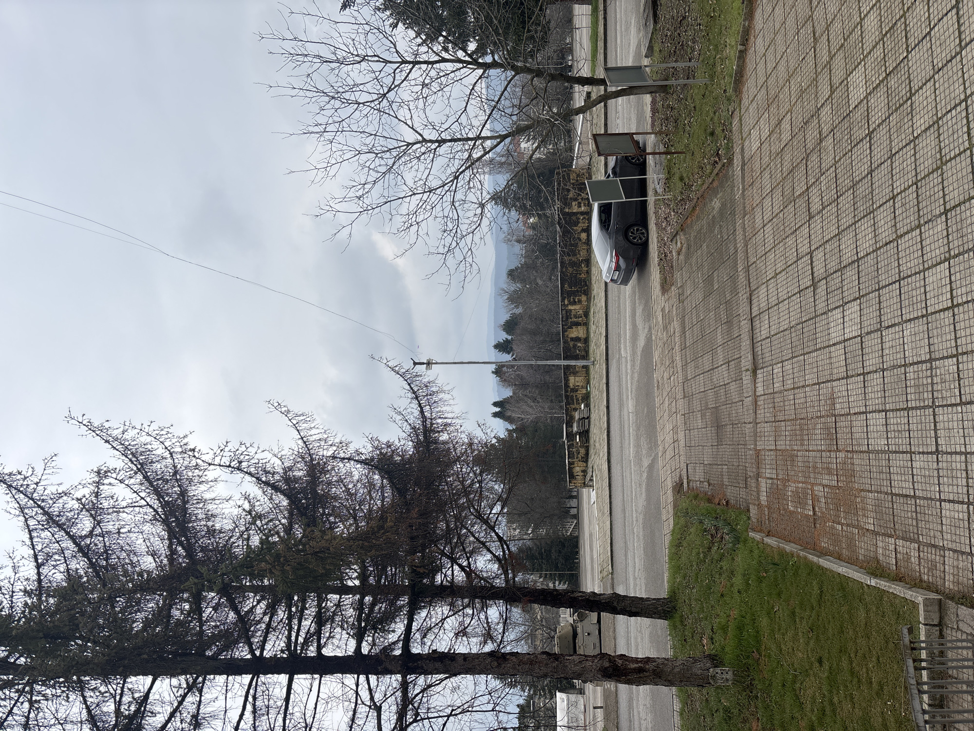 The image depicts an outdoor urban scene in Veliko Tarnovo, Bulgaria, under an overcast sky, suggesting cool weather. The vantage point is slightly elevated, looking across a street toward a public area. In the immediate foreground, a metal railing is partially visible at the bottom left. A grey tiled pavement with a grid pattern covers the lower portion of the frame, bordered on its left by a narrow strip of green grass. Two large conifer trees with sparse, dark branches stand prominently on the left side of the frame, growing from the grassy area. Beyond the paved area and grass strip, an asphalt road runs horizontally. On the far side of this road, a dark grey sedan (Toyota Corolla) is parked diagonally, facing away from the viewer, with its rear right wheel partially over a curb. To the right of the parked car, three empty, rectangular information or advertising boards with light-colored frames are visible. A bare deciduous tree with thin branches stands to the right of these boards. Further into the midground, to the left of the parked car and partially obscured by the two prominent conifer trees, a light-colored T-34 tank monument is visible on a large paved surface. Behind this area, a long, low, yellowish-brown concrete wall or structure extends horizontally. The background features distant rolling hills covered with a mix of bare deciduous trees and evergreen conifers. Scattered multi-story buildings, including one with a reddish roof, are visible among the distant trees. The sky is uniformly overcast with shades of grey. A thin utility wire traverses the upper-middle portion of the sky, and a utility pole is partially visible on the far right. No individuals are present in the scene.