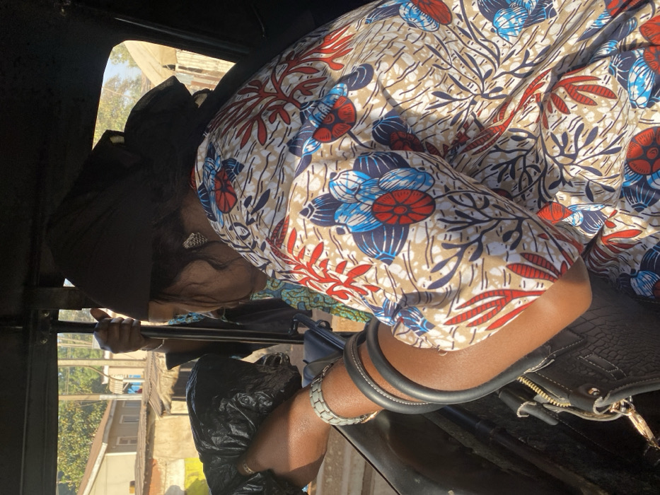 An outdoor scene in Nassarawa, Nigeria, is depicted from within a vehicle during daylight hours. The primary subject is a woman of dark complexion, viewed from her left side and back. She wears a black headscarf styled as a gele, silver-toned textured stud earrings, and a loose-fitting blouse featuring a beige background adorned with red, blue, and dark blue patterned motifs resembling coral and shells. On her left wrist, she wears a grey-green textured watch and multiple black bangles. Her left hand firmly grasps a black plastic bag, which appears full. A black handbag with textured material and gold-colored hardware is situated near her arm. Partially visible behind her is another individual's hand, holding onto a vertical black metal bar, who also wears a silver-colored wrist ornament. The interior structure of the vehicle features black metal framing. Beyond the vehicle's opening, a sunlit street is visible, revealing several low-rise buildings, some with corrugated roofs, and sparse vegetation in the background. The scene is illuminated by bright natural light, casting distinct shadows.