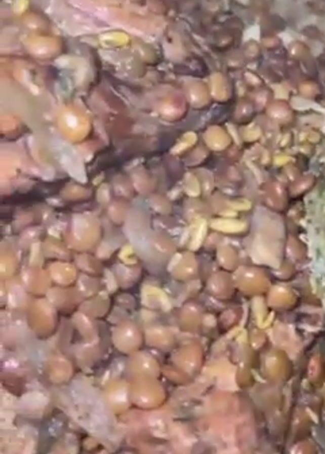plate of food, likely a Middle Eastern or Mediterranean dish. The plate has lentils and pieces of what appear to be cooked chicken, along with onion. Placed on top of this mixture are green patties. The camera zooms out to show the entire plate on a tablecloth with a floral design.