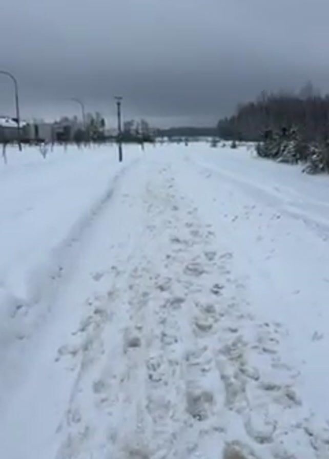 snowy path leading away from the camera. The path is covered in snow that has been churned up by footprints and tire tracks. On either side of the path is a deeper layer of untracked snow. In the background, there are streetlights lining the path, and some buildings can be seen on the left. On the right is a line of trees. The sky is overcast.