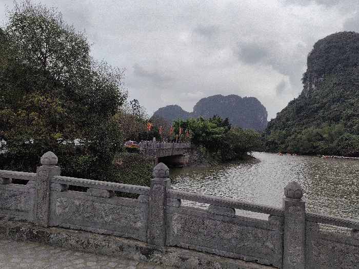 The image depicts a panoramic view of a riverine landscape within Hoa Lư Ward, Vietnam, under an overcast sky. In the immediate foreground, a weathered grey stone railing, approximately hip-height, extends horizontally across the frame. This railing features carved decorative panels and prominent newel posts topped with what appear to be stylized lotus bud finials. The ground directly beneath the railing is paved with irregular stone blocks. Mid-ground to the left, a multi-arch concrete or stone bridge spans the waterway, its railing adorned with several vertical orange and red flags. Trees with dense green foliage flank both sides of the bridge and the riverbanks. On the far side of this bridge, partially obscured by trees, outlines of vehicles, including a red car, are visible on what appears to be a road. A dark, winding river or canal dominates the central and right portions of the image, flowing from the background towards the foreground, passing under the mid-ground bridge. The water surface is textured with small ripples. Numerous small, narrow boats, likely sampans or kayaks, are visible on the river in the mid-ground and background, carrying individuals, some of whom are identifiable by orange life vests. The background is characterized by majestic, steep limestone karsts (mountains) covered in dense green vegetation, receding into the cloudy distance. The sky is uniformly grey and overcast, indicating diffused lighting conditions. No direct sunlight is apparent.