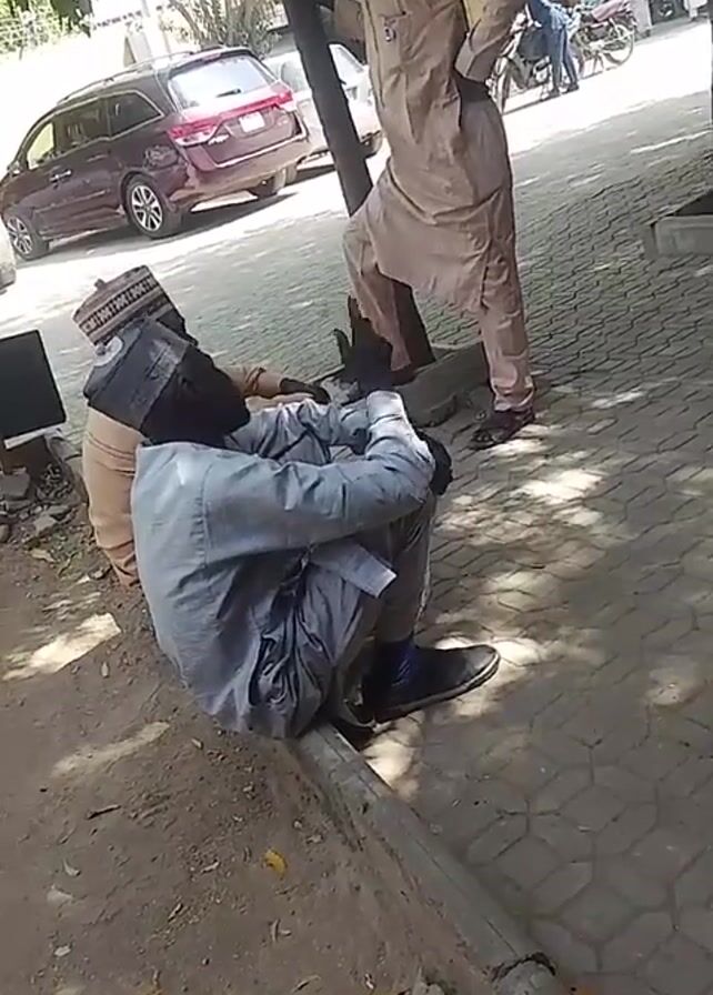 three men outside, standing or sitting near the base of a tree. One man in a light brown outfit is standing, leaning against the tree with one hand on his hip. Another man, in a similar outfit and hat, is sitting on the ground beside a man dressed in grey. The man in grey is seated on a concrete curb, with his head down. Cars and motorbikes are visible in the background. The ground is paved with interlocking pavers in a hexagonal pattern. Some fallen leaves lie on the bare earth beside the curb.