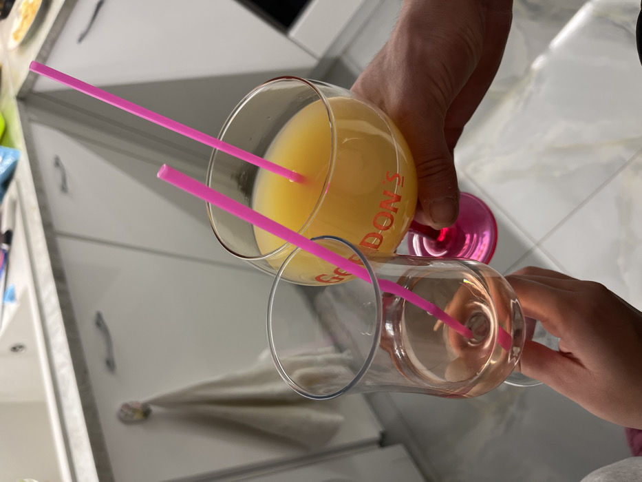 Two individuals are pictured in a kitchen in Varna, Bulgaria, holding glasses in a celebratory pose. A male hand holds a large, clear, stemmed glass with a bright pink base and stem, containing a yellow-orange liquid and two vertical pink plastic straws. The glass features "GORDON'S" printed in red capital letters on its side. Adjacent, a female hand holds a smaller, clear stemmed glass containing a pale pink liquid and one vertical pink plastic straw. The background reveals a modern kitchen environment with white cabinet doors featuring silver-colored bar handles, a white sink, and a white hand towel hanging on a hook. The countertop is light-colored with a speckled pattern, and the floor consists of large, light-colored tiles with subtle patterns.