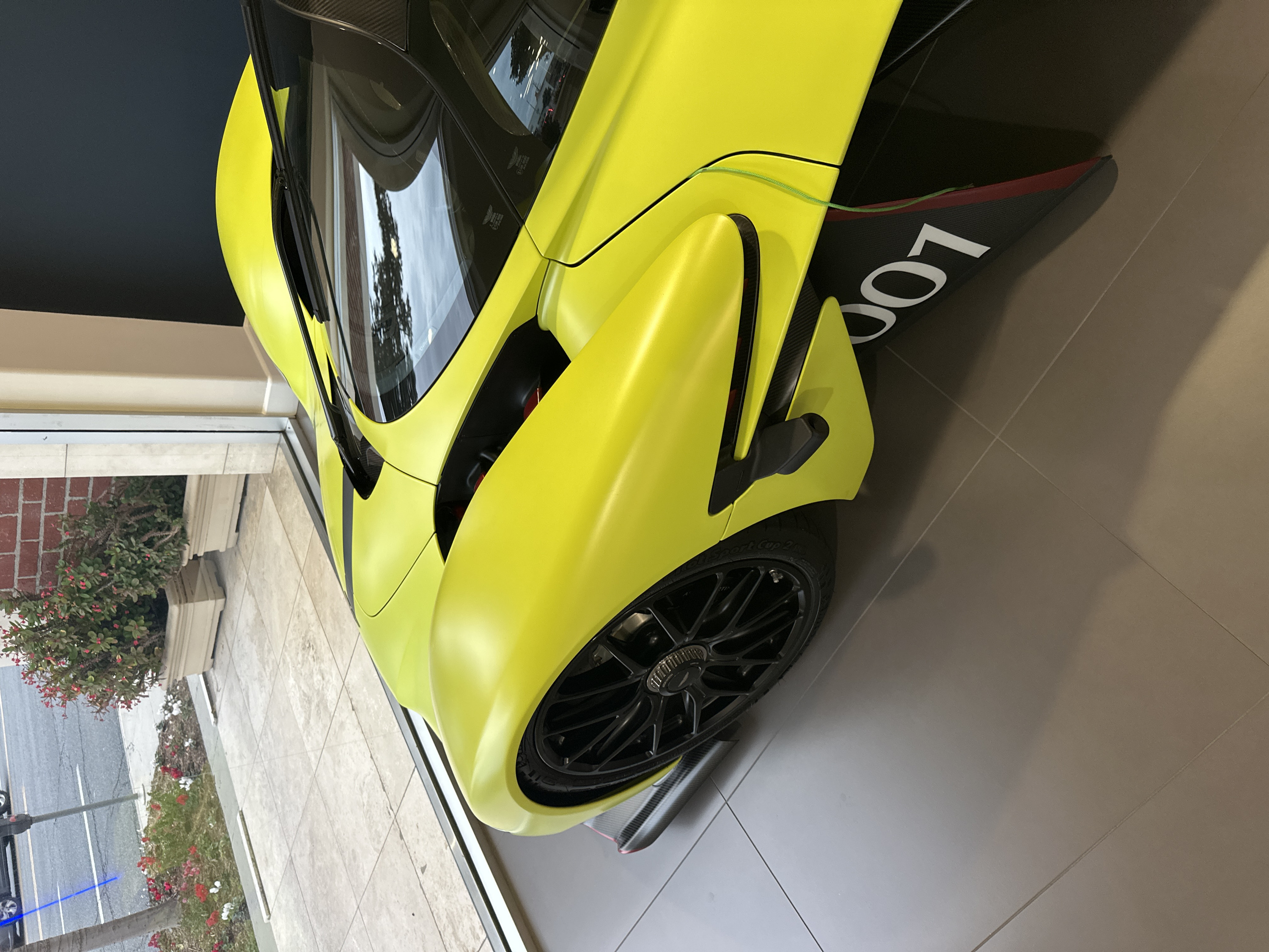 A close-up, high-angle shot reveals the front of a neon yellow and black sports car. The sleek lines curve around a black wheel with a detailed center. Reflections are visible on the car's windows. The car is inside a building with tiled floors and a plant outside the window. The number "007" is visible on the car's side.