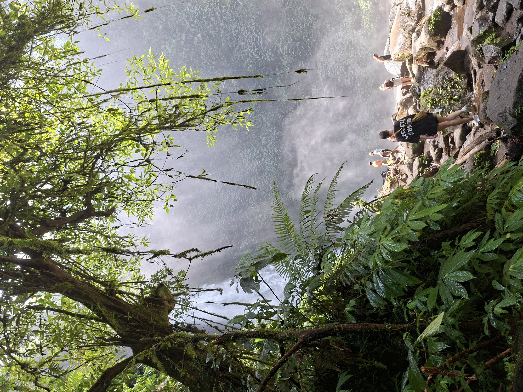 The image captures a scene at a waterfall in Petang, Indonesia. The viewpoint is oriented such that the waterfall appears vertical, with lush green foliage predominantly framing the left and bottom of the frame. A group of people is situated on a rocky outcropping to the upper right of the waterfall, with one individual in a black shirt standing prominently. The waterfall itself creates a mist in the background. Moss covers many tree branches and surfaces.