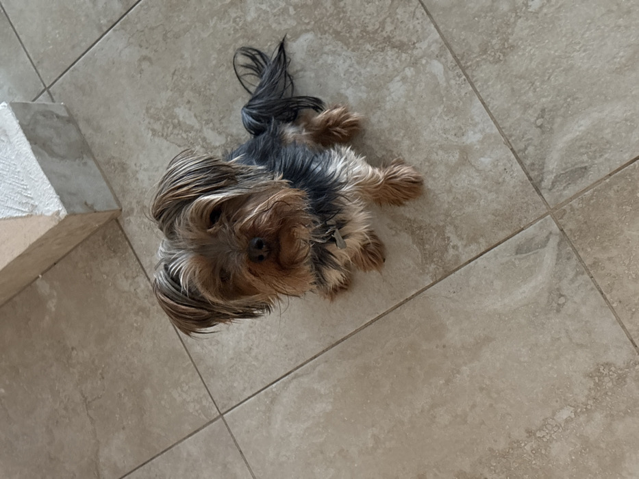 - "A small, long-haired dog lies on a tiled floor" by FM-ZjnhV2, licensed under CC BY 4.0