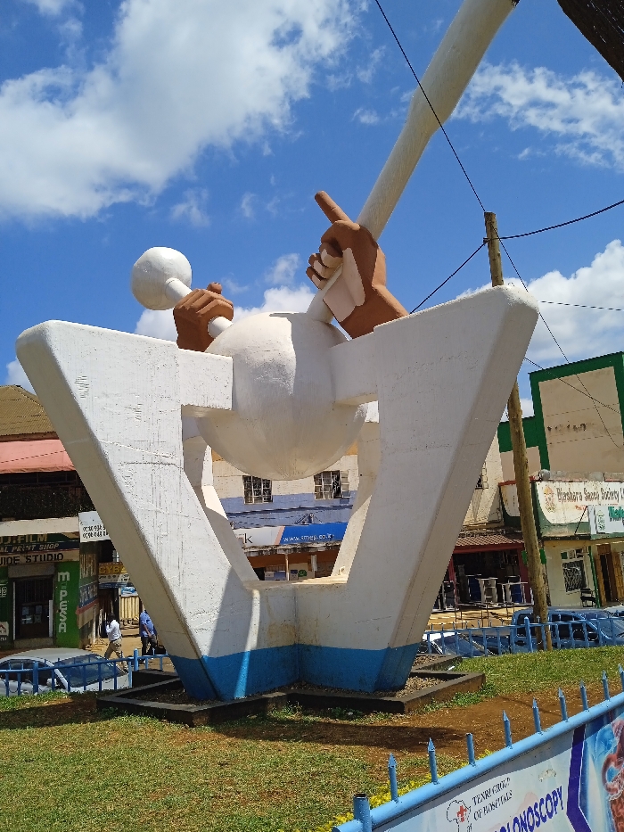 A daytime, eye-level photograph captures the Embu Freedom Fighter Monument situated at a roundabout in Embu, Kenya