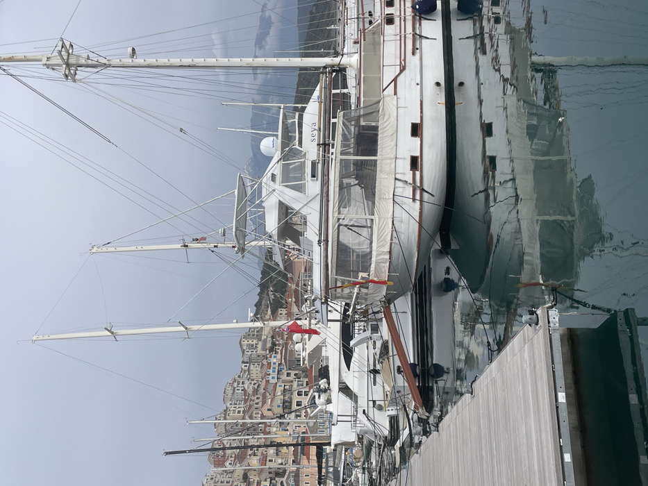 The image displays a marina in Radovići, Montenegro, under an overcast, light gray sky. In the foreground, a light gray wooden dock extends diagonally from the lower left. Multiple white boats are moored to this dock in calm, teal-colored water that reflects the vessels and structures. Prominently featured in the mid-right is a white classic-style yacht with brown trim lines, a rounded hull, and clear vinyl enclosures covering its stern superstructure. A small flag, possibly red and yellow, is affixed to its stern. Adjacent and slightly behind, a modern white motor yacht, identified by the name "seya" on its stern, features a flybridge with a white framework and a white radar dome antenna on its roof. A red flag is visible flying from this yacht's mast or antenna structure. Numerous other white powerboats and sailboats, characterized by their various mast configurations and superstructures, are visible further along the dock. In the background, a densely constructed town occupies a steep hillside, with buildings predominantly light-colored (white, beige, light orange) and topped with red-tiled roofs, extending upwards from the waterfront. Beyond the town, distant mountains are visible, with their peaks partially obscured by clouds or mist and exhibiting patches of snow. No individuals or specific actions are depicted.