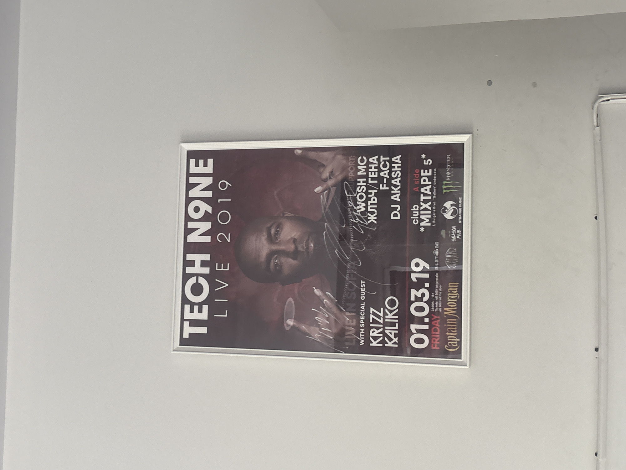 A framed poster for a Tech N9ne "Live 2019" concert is mounted on a light gray wall