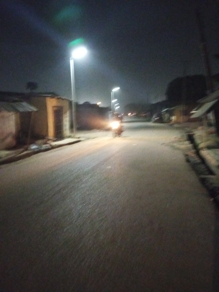 A street at night, illuminated by streetlights. A motorcycle with its headlight on travels down the road. Simple buildings line either side. The road stretches into the distance under a dark sky.
