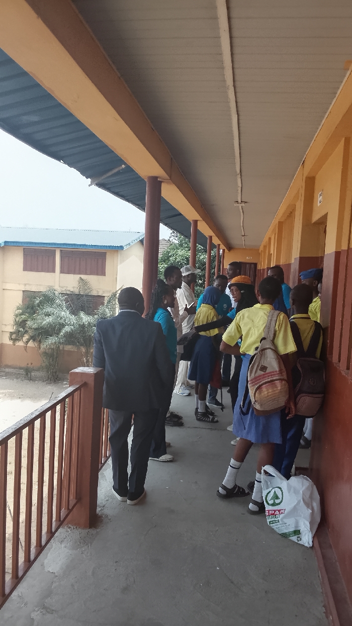group of people standing on a concrete covered porch of a school building. The location is a school building in the town of Street in Nigeria. The latitude and longitude coordinates are 6.487, 3.36. There are 12 individuals visible in the image. A man dressed in a black suit is standing near the left side of the image, leaning against a wooden railing. There are children standing in the background. The building's walls are painted yellow and are lined with columns and a roof that is made of corrugated metal. The floor of the porch is a grey cement. There is a white plastic bag with a green logo on the ground next to a student.