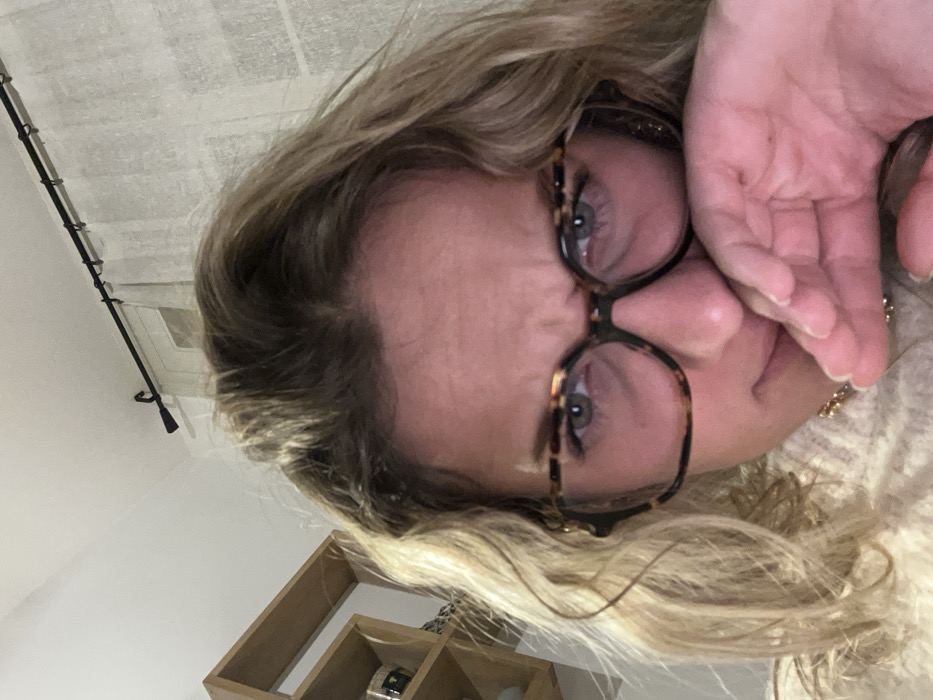 A woman with blondish-brown hair, tortoiseshell glasses, and a fair complexion looks towards the camera. Her hand rests near her face. Part of a wooden shelving unit is visible in the lower-left. A curtain rod and curtain are visible in the upper-left. She wears a light-colored sweater with a chain necklace. The image is taken from an unusual angle, rotated counter-clockwise.