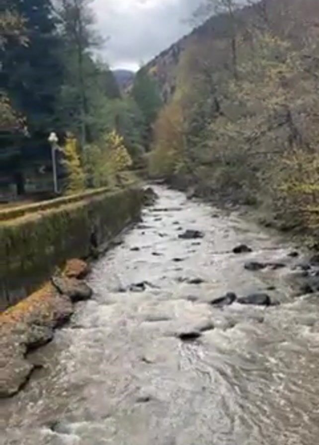 river flowing through a wooded area. The river is shallow and rocky, with the water flowing quickly. There are trees on both sides of the river, and the leaves are turning yellow and brown. The sky is cloudy. The camera moves to the left, focusing on a small metal bridge. The bridge has a wooden deck and metal railings. On the other side of the bridge, there is a park with a few small buildings, a vintage truck, and other abandoned items.