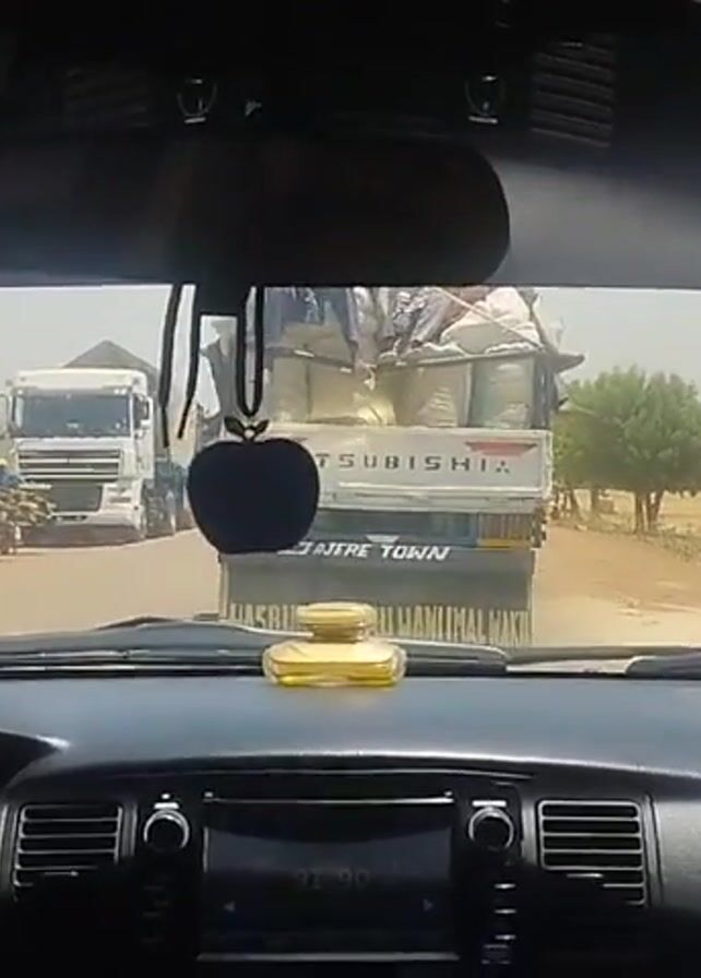 The video is shot from inside a car stopped at a dusty intersection. In front of the car, there are several large trucks. One truck is labeled "MITSUBISHI" and has multiple people sitting on top of its load of what appear to be bags of grain or similar material. There are also several people on motorcycles near the trucks. The environment is dry and rural, with sparse vegetation and utility poles visible in the background. The car's dashboard is visible, including the steering wheel, radio, and rearview mirror with a hanging apple-shaped ornament. The overall atmosphere is somewhat chaotic, likely due to the congestion caused by the trucks.