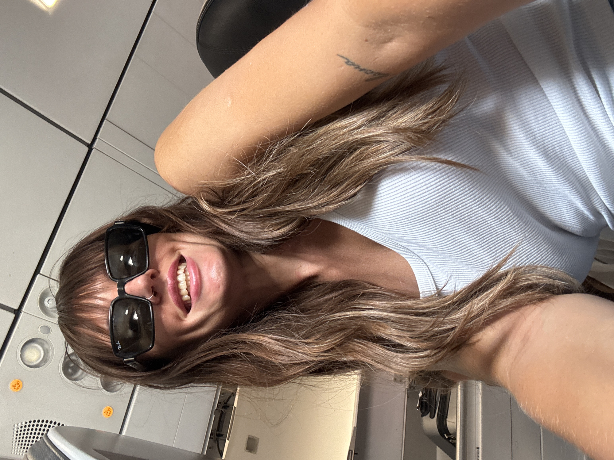 An adult female is depicted in a close-up, upward-angle selfie taken within an aircraft cabin, during travel to or from Kuta, Indonesia. She possesses long, wavy, brown hair with lighter highlights and a tanned complexion. She wears rectangular black sunglasses with the "Ray-Ban" logo visible on the left lens, a small nose ring in her right nostril, and a light-colored, ribbed tank top. Her lips are parted in a wide smile, revealing upper and lower teeth. A script tattoo is visible on her left forearm. The background consists of the aircraft's light grey overhead paneling, featuring individual air vents, passenger reading lights, and illuminated "no smoking" and "fasten seatbelt" pictogram signs. A dark-colored seat headrest is partially visible on the right side of the frame. Overhead bins are partially visible in the upper left background. The scene is illuminated by interior cabin lighting.
