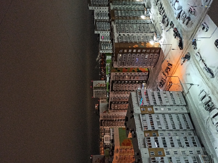 The image displays a nighttime cityscape, likely in a cold climate due to the presence of snow. Tall apartment buildings are arranged in rows along a street. Car parks with snow-covered vehicles sit to the right. Dim streetlights illuminate the area. The sky is dark and overcast, blending into the darkness beyond the city.