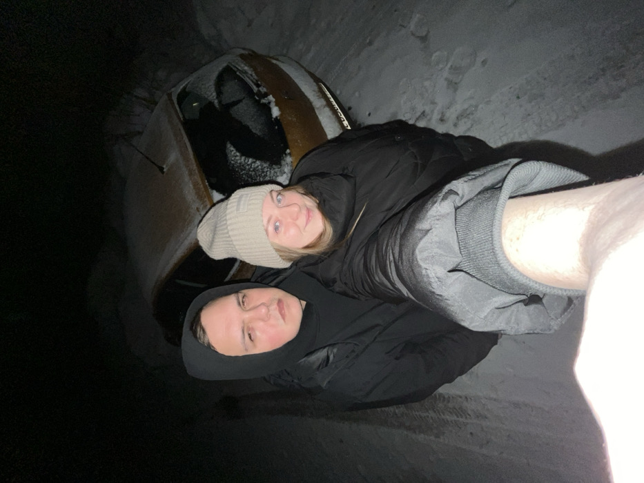 The image displays a nighttime scene in Раздолье, Russia, featuring two individuals standing in a snow-covered environment beside a stationary vehicle. On the left, a male subject, dressed in a black hooded jacket with the hood up, looks directly at the camera with a serious expression. To his right, a female subject, wearing a beige knit beanie and a black puffer jacket, presents a slight smile while also looking at the camera. The photograph appears to be a selfie, with the arm and hand holding the camera visible in the lower right foreground. Behind the individuals, a gold or light brown two-door hatchback vehicle is partially obscured by a layer of fresh snow on its roof, hood, and rear window. A partial rear license plate, possibly displaying "LUO08", is visible. The ground is covered in snow, showing distinct tire tracks and footprints.