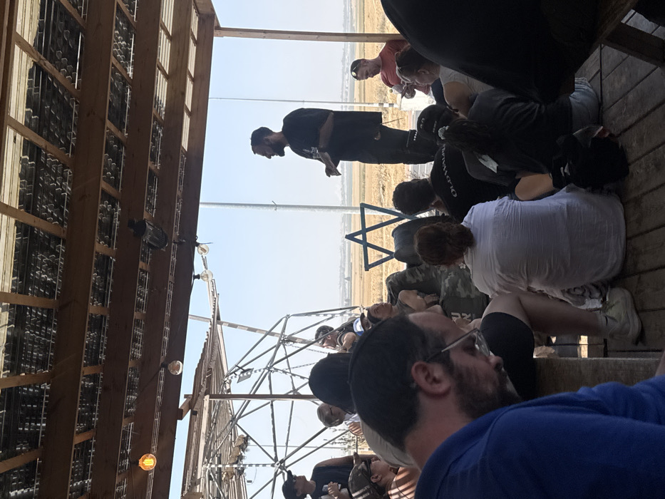 The image depicts an outdoor gathering within the Sdot Negev Regional Council, Israel, under a wooden pergola roof with corrugated panels and embedded glass bottles