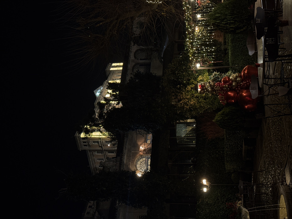 An ornate, illuminated building stands against the dark night sky, partially obscured by trees. A nearby courtyard is decorated with strings of lights and a cluster of red and gold balloons. Outdoor seating is visible, suggesting a festive or celebratory atmosphere. The scene conveys an elegant, perhaps historical, setting at nighttime.
