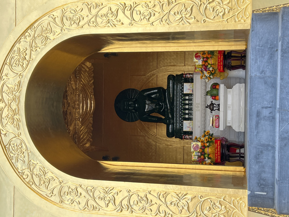 This image depicts a dark, seated Buddha statue enshrined within a highly ornate, gilded archway structure, located in Diên Khánh, Vietnam