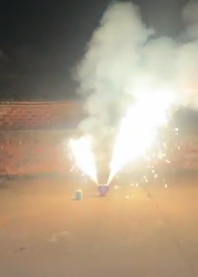 A firework is seen exploding in the dark of night. The firework shoots two streams of flame upward with sparks flying outward. A large plume of white smoke rises above the exploding firework. The firework sits on a concrete surface in front of a brick wall.