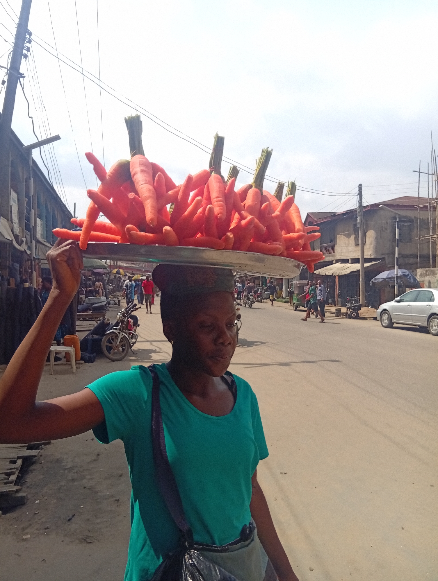 - "An adult female, positioned in the foreground, walks left-to-right on a paved road in Umuode, Nigeria, while balancing a large, circular metal tray of orange carrots on her head" by FM-Km2ma2, licensed under CC BY 4.0