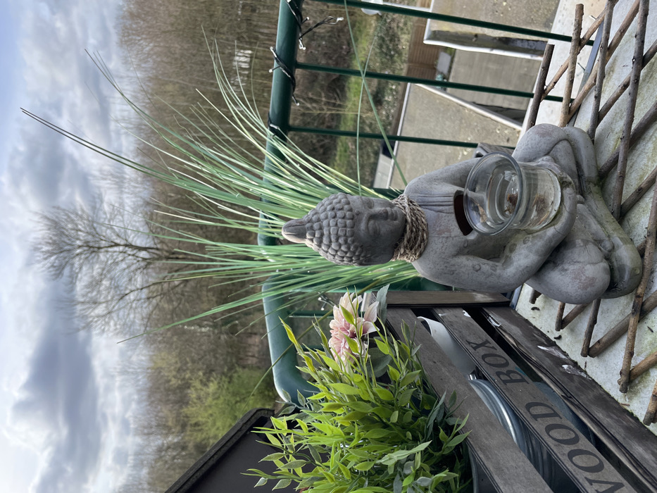 An outdoor balcony scene in Unknown, Unknown, features a gray, weathered Buddha statue seated on an arrangement of interwoven wooden sticks. The statue wears a coiled jute rope around its neck and holds a clear glass votive filled with water containing a small piece of brown debris. To the left, a weathered wooden planter box, partially labeled "WOOD BOX", contains two potted plants: one with dense green foliage and another with a single pink artificial flower. Behind the Buddha, a tall artificial plant with thin, light green blades rises upwards. A dark green metal balcony railing, adorned with a string of white fairy lights, extends across the midground. Beyond the railing, a lower paved area is visible, followed by additional green fencing and a dense background of trees with minimal foliage, under an overcast sky. No individuals or active events are present within the frame.