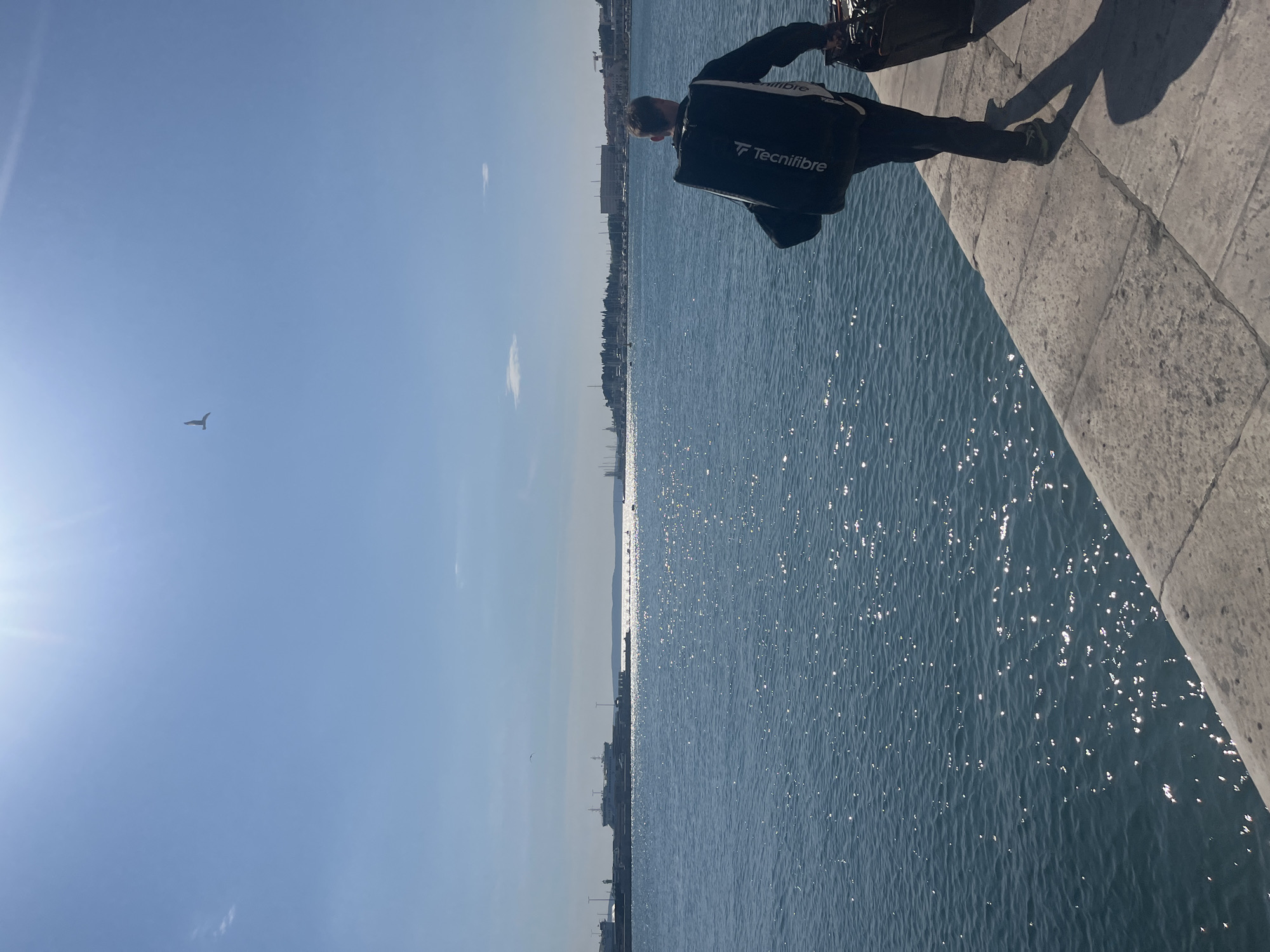 The image captures a scene in Split, Croatia, alongside the waterfront. A person stands on a light grey concrete walkway facing the Adriatic Sea. The person is wearing dark clothing and a black backpack branded with "Tecnifibre" in white letters. Their shadow stretches onto the walkway. The water is a deep blue, reflecting sunlight in shimmering patterns. Across the water, the coastline of Split is visible, showing buildings and infrastructure along the shore. The sky is clear blue with the sun shining brightly, and a bird is seen flying high in the distance.