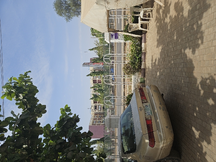 The image presents an outdoor scene located in Unguwar Shanu, Nigeria, under a clear blue sky with scattered wispy clouds. In the immediate foreground, a gold-colored Toyota Camry sedan is parked on a paved surface composed of light brown interlocking bricks. The vehicle is angled with its rear facing the viewer, exhibiting paint wear and peeling on the rear bumper. The license plate reads "KSC 111GF." Tree branches with green leaves extend into the upper left quadrant, casting shadows on the paved ground. To the right, a section of a light-colored canvas tent structure is visible, alongside two unoccupied white plastic chairs. Separating this area from a road is a white metal fence constructed with arched segments. Behind the fence, there are small green shrubs and taller trees. A security camera is mounted on a grey pillar behind the fence, positioned to the left of the tent. Across the multi-lane road, a large multi-story building complex with pinkish-brown and light-colored sections is visible. A line of slender trees stands in front of this building. To the right of the main building, a tall structure with red and white markings rises. No individuals, actions, or interactions are observable within the frame.
