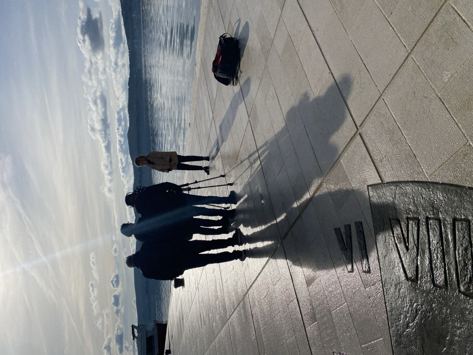 The image depicts an outdoor video recording session taking place on a paved waterfront promenade in Tivat, Montenegro. Four individuals are present. Three individuals are positioned with their backs to the viewer, largely silhouetted, and are facing a fourth individual. One of the three operates a video camera mounted on a black tripod and wears over-ear headphones. The fourth individual, a woman with light-colored hair, stands facing the camera crew, wearing a light-colored, possibly beige, jacket and dark trousers. Long, distinct shadows of the four individuals and the tripod extend diagonally across the light-colored, rectangular tiled pavement towards the bottom-left foreground. To the right of the interview setup, a dark camera bag with red accents is resting on the pavement. In the bottom-left corner, a dark, flat, metallic plaque is embedded into the pavement, displaying partially legible text, including the word "TIVAT". To the far left of the frame, a large boat with a white hull and red accents is partially visible, docked at the promenade. A mooring bollard is also present on the left edge. The background features a wide expanse of water with gentle ripples, bordered by distant, forested hills or mountains under a sky with scattered clouds. Strong directional sunlight, originating from the upper-left behind the camera crew, illuminates the scene and creates visible sun rays in the upper sky.