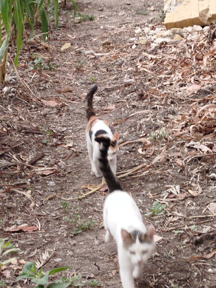 Two cats are walking away on a narrow path covered in dirt and dried leaves. The first cat is calico with a long tail held upright. The second cat, closer to the viewer, is predominantly white, also with a tail held high. Vegetation grows along the edges of the path and a brick structure is visible in the upper right corner.