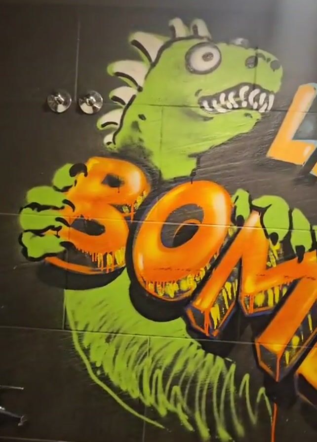 interior of a bathroom. The walls are covered in black tiles with graffiti in orange, green, and yellow paint. The graffiti includes a cartoon dinosaur, the words "LA LA GAR TIXA LACOSF," and other phrases. A gray sink and a white toilet are visible in the bathroom. The lighting is bright. The video pans slightly across the bathroom's interior.