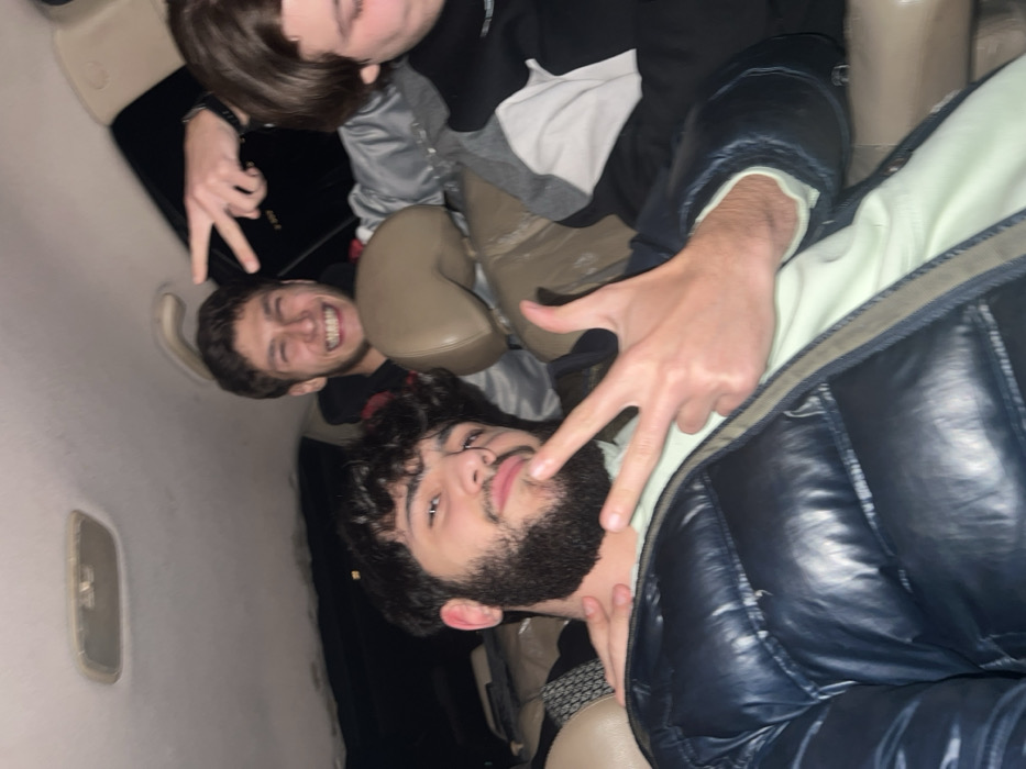 Three young men are posed inside a vehicle, possibly a car or van. Two of them are flashing the "peace" or "two" sign with their fingers. The man closest to the camera has dark, curly hair and a beard, wearing a puffy, dark blue jacket. Another man, behind him, is smiling broadly and another man above him is in a black and grey jacket. The interior appears to be beige or light brown.
