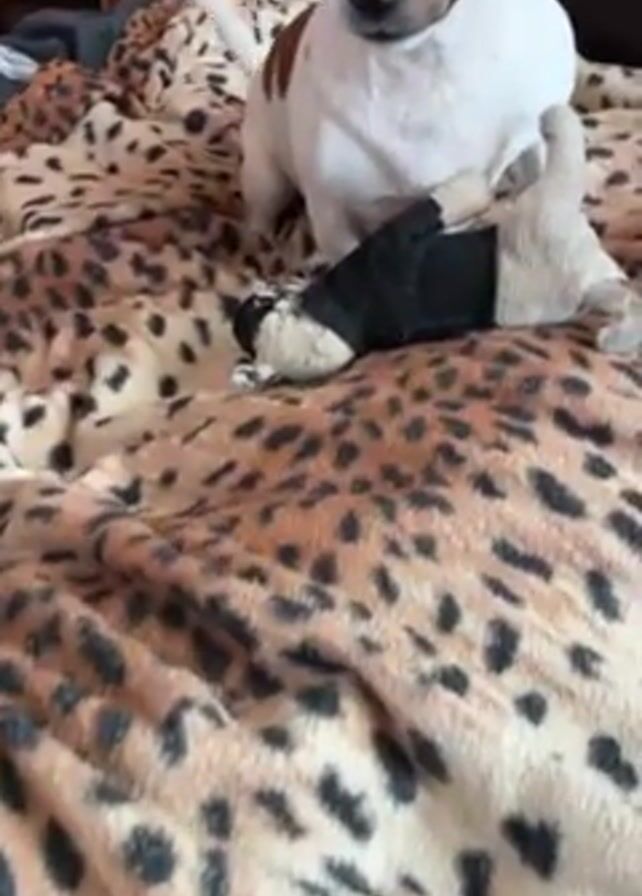 A close-up shot shows a Jack Russell Terrier on a bed covered with a leopard-print blanket. The dog is white and brown, and it's initially positioned next to a stuffed toy dressed in black clothing. The dog licks its nose and then moves toward a person's hand, which appears to be resting on a leg clad in gray sweatpants. The dog sniffs and nuzzles the hand, interacting playfully. The camera angle is slightly above, looking down on the bed. The lighting appears to be natural, indicating an indoor environment. The background is blurred, suggesting a room with wooden furniture.