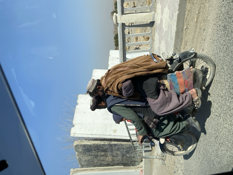 Two men ride a small motorcycle along a road, captured from inside a vehicle. The driver, dressed in a green coat, steers the motorcycle. The passenger, sporting a brown shawl, is seated behind him. The motorcycle is loaded with a colorful rug. Concrete barriers and an ornate fence line the road. A hazy sky is visible in the background.