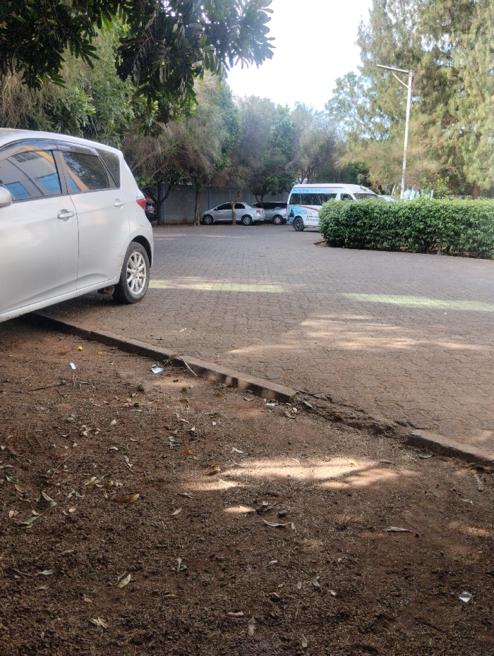 parking area with several vehicles, including a silver hatchback prominently in the foreground on the left, a white van with blue graphics, and two smaller silver cars parked further back. A green hedge sits beside the van. The parking lot is paved with bricks. A strip of soil with leaves and litter is in the foreground, separated from the paved area by a curb. Trees partially obscure the background. A light pole is visible in the distance, on the right side.