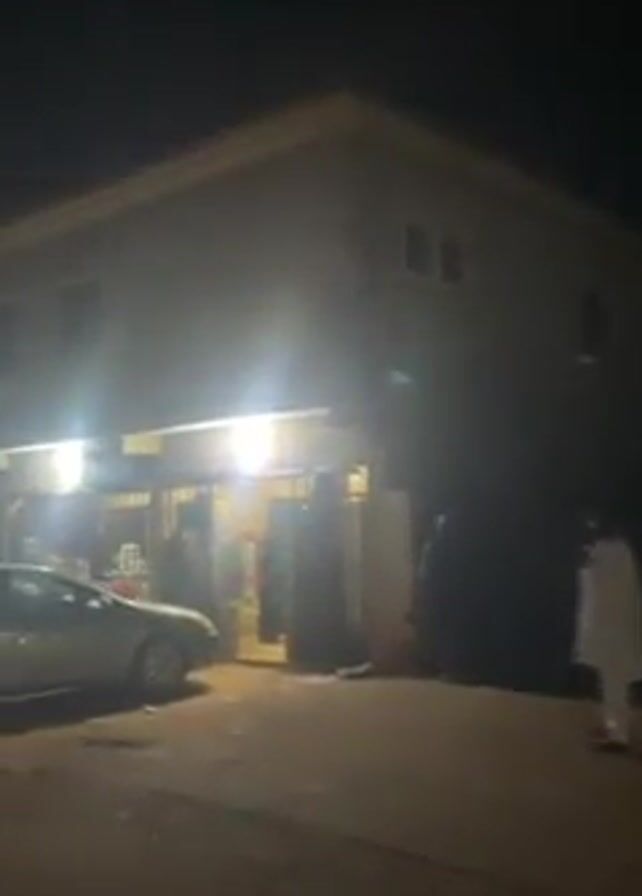 At night, the video shows a two-story building with bright lights shining on the front. Cars are parked nearby, including a silver sedan and a white Toyota pickup truck. Several people are gathered outside the building, some wearing white clothing. The video moves slightly, showing the cars and people from different angles.