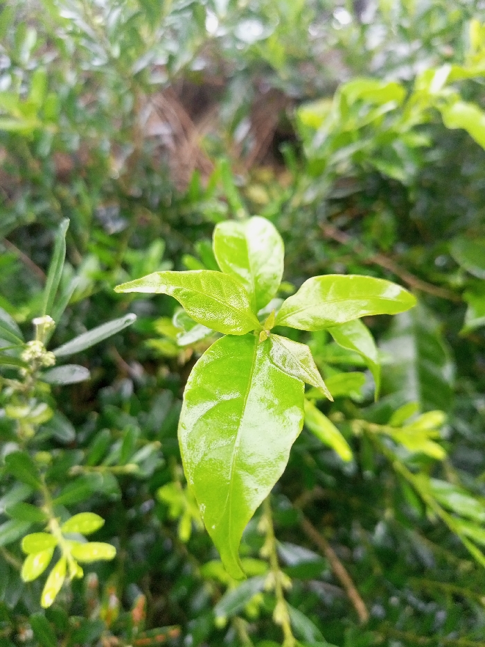 The image depicts a close-up view of vibrant light green foliage, presumably within the city of Beni, Nepal. A central cluster of 3-4 glossy, ovate leaves, indicative of new growth, is sharply in focus and appears wet or dew-covered. The surrounding background consists of blurred, darker green leaves and branches, indicating a dense plant environment. Small, pale green buds or developing flowers are visible on a stalk in the out-of-focus lower left portion of the frame. No individuals, animals, or man-made objects are present. The lighting is diffuse, suggesting an overcast condition or filtered sunlight.
