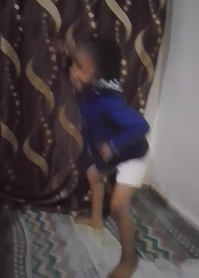 young girl, likely under the age of 5, dancing. She is standing on a rug in a room with a curtain as the backdrop. The curtain is patterned with swirling, gold-colored designs on a brown background. The rug beneath the girl has a zigzag pattern in various shades of brown and teal. The walls appear to be painted white. The girl is dressed in a royal blue jacket with silver buttons and white shorts. She has her hair braided in pigtails adorned with white beads. The girl is dancing in a sassy manner, posing with her hands on her hips, moving her head, and making silly faces. The soundtrack of the video has a rhythmic, driving beat with a male voice repeating words in another language.